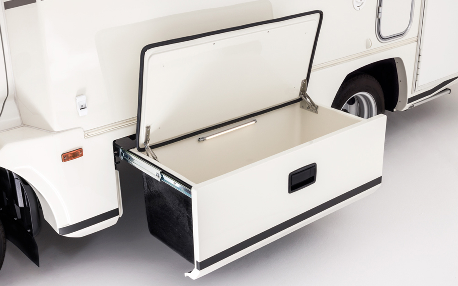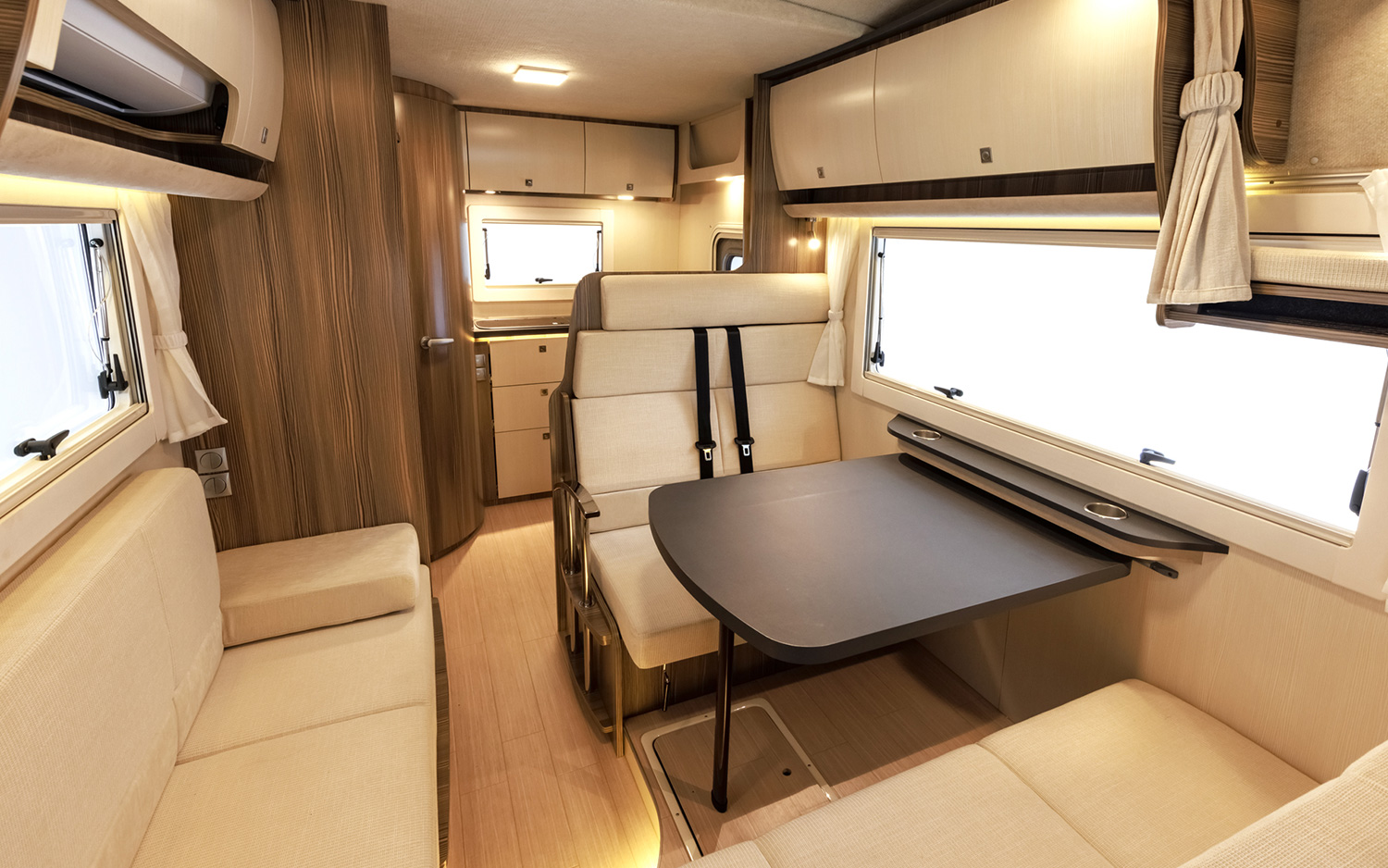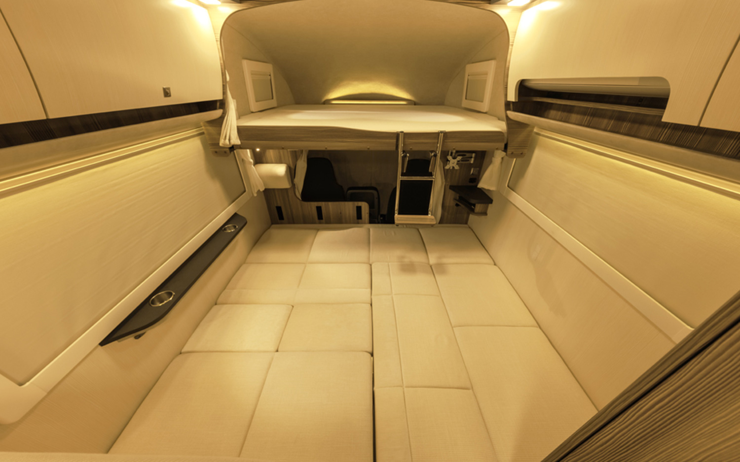 快適な旅空間の提案。 広々としたリビング空間と多彩なシートアレンジで、家族や仲間と快適に過ごせるキャンピングカー。機能的なキッチンは調理や片付けがしやすく、長旅でも安心。大型収納やサイドオーニング、充実の装備を備え、移動中も滞在中も快適な時間を楽しめます。 スペック ベース車両TOYOTA カムロード 駆動4WD 燃料軽油 排気量2,982cc 車体寸法全長5,160mm×全幅2,070mm×全高2,950mm ベッド寸法 バンクベッド1,980mm×1,865mm ×1 ※ツインロフト ソファベッド1,900mm×1,850mm ×1 ※概数 乗車定員6名 就寝定員5名 設備・装備カーナビ/ETC/バックカメラ/液晶テレビ/冷蔵庫 90L/ガスコンロ/電子レンジ/トリプルサブバッテリー/100Vコンセント/FFヒーター/ルームエアコン/ベンチレーター 車内レイアウト 走行時 就寝時 ご予約状況